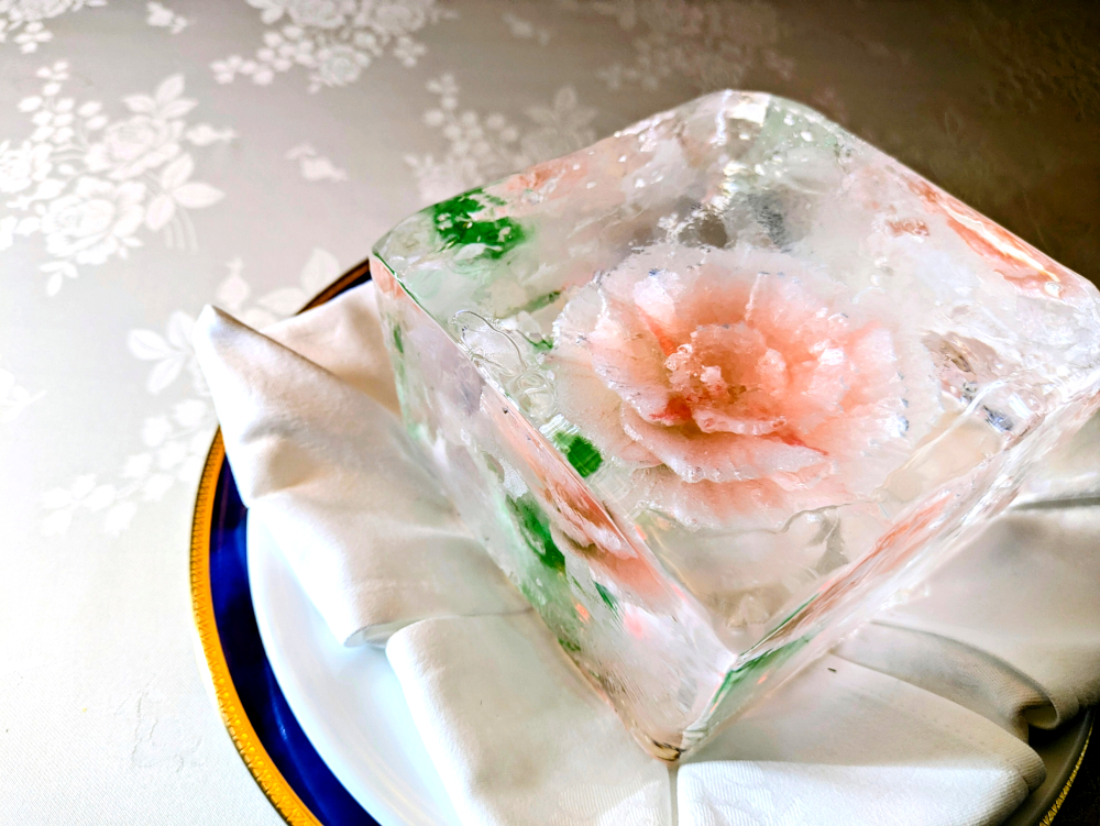 氷で作ったお花が記念日の演出を彩ります。フレンチのシェフが作る氷のお花は